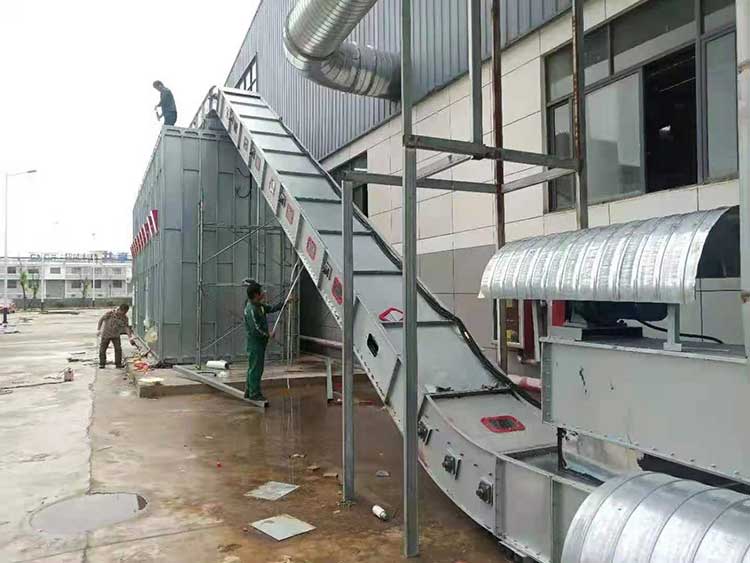 5、火情檢測盒滅火系統(tǒng):設(shè)備出風(fēng)口設(shè)置火情檢測探頭用于火情檢測。滅火噴淋裝置安裝于主風(fēng)筒內(nèi),用于滅火,以有效保護系統(tǒng)的運行安全。探測器探測到火情時,立即報警,關(guān)閉主機,同時開啟消防泵進行噴淋滅火。
