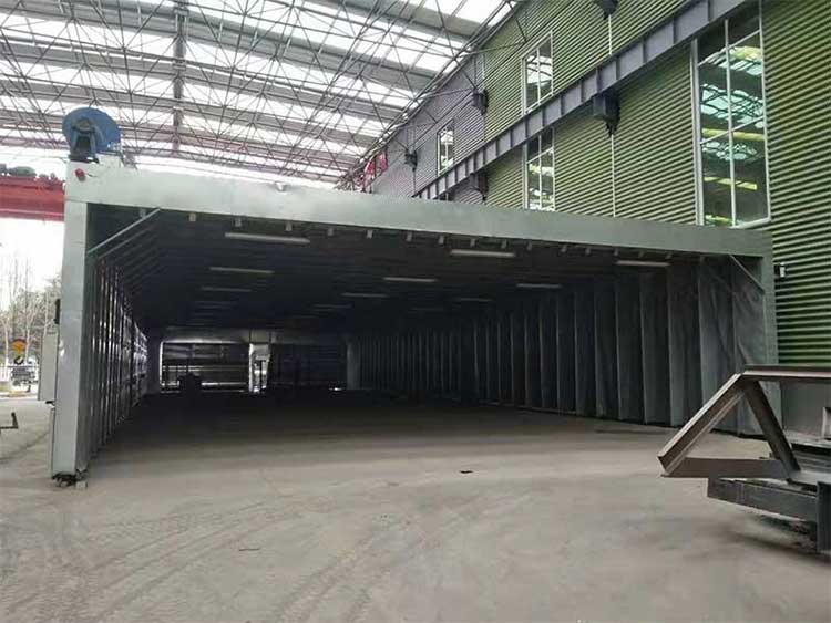 ,因為鋼管的工件比較長,為了方便工件的運轉,提高生產(chǎn)效率,以及有效的收集漆霧顆粒,故需要一臺長24米,寬6米,高4米的移動伸縮噴漆房。移動噴漆房框架使用鍍鋅方管制作,移動伸縮房蓬布使用三防布制作,內部設有防爆炸照明裝置,佑泰環(huán)保制作的移動伸縮噴漆房,使用機器人焊接,安裝后外觀美麗大方,結實耐用。