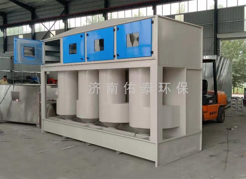 2、氣旋噴漆柜,移動伸縮房固定端設置一臺6米長氣旋噴漆柜,噴漆產(chǎn)生的漆霧顆粒,在風機的遷引下,一部分漆霧顆粒吸附在水簾上面并落入水池中。絕大部分漆霧顆粒經(jīng)過氣旋裝置及漆霧分離裝置的碰撞,***后也落入水池之中。漆霧去除率達到95%以上。從頁排出不含漆霧顆粒的有機廢氣。為后續(xù)催化燃燒設備的正常運行,提供良好的預處理條件。
