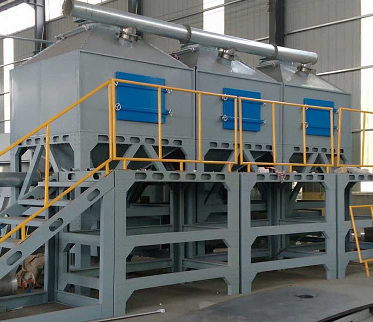 一級旋流板塔)然后再進(jìn)入干式過濾器,在室中以緩慢速度通過,接觸時間為1.0秒以上,去除廢氣