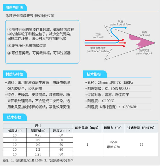 V型干式過濾紙,又稱油漆過濾紙,漆霧過濾紙、折疊式過濾紙板。是使用于干式噴漆房內的一種環(huán)保型產品,可有效過濾油漆類,油類,玻璃原料,環(huán)氧樹指,柏油,鐵弗龍,液化工件,塑膠,烤瓷,染料,涂裝類廢氣顆粒,過濾效果高達90%以上,在噴房工作環(huán)境要求較高或者濕度較大時使用仍然有效果。