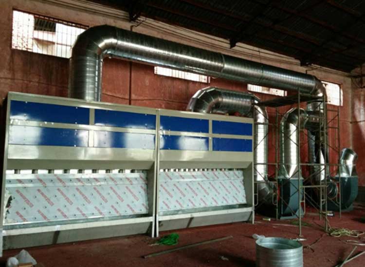 4、利用污水泵提升水箱中的水形成循環(huán)水幕,利用離心式風(fēng)機(jī)抽風(fēng),對(duì)噴漆作業(yè)過程中的漆霧有很強(qiáng)的吸附能力。通過獨(dú)特的水旋式處理,使漆霧與水汽更好的得到混合,從而落入污水槽中。