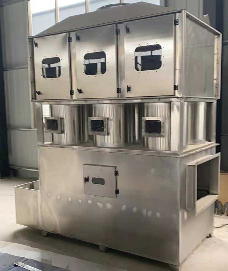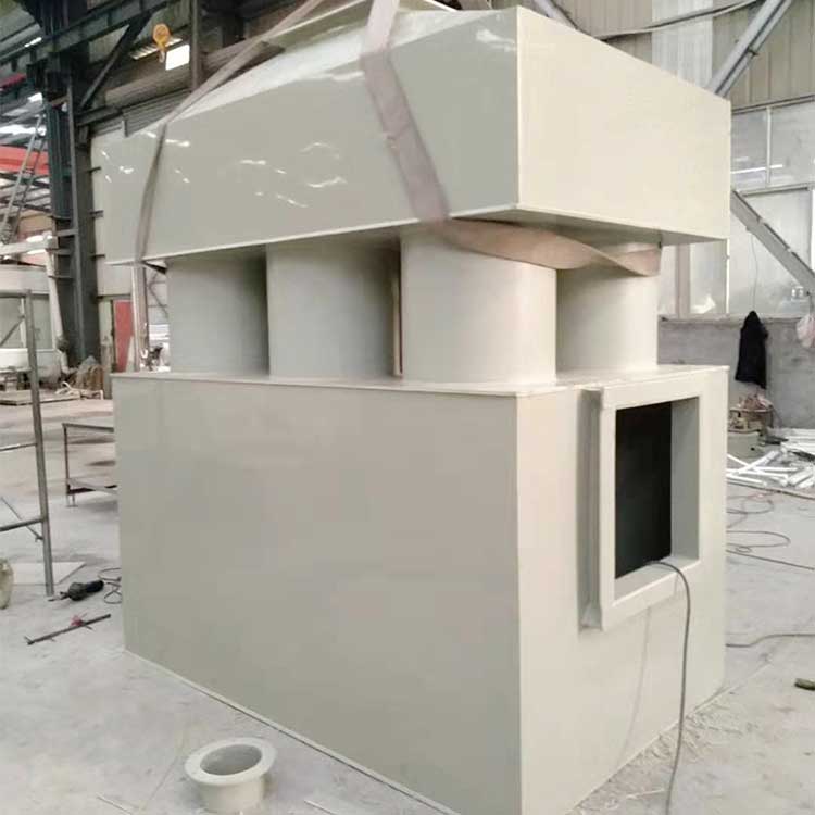 3、2萬風量方形旋流噴淋塔尺寸為L2.4*W1.3*H3米,有6個旋流筒。一個水泵,一般使用pp板或201不銹鋼制作。