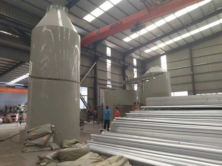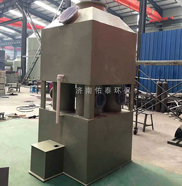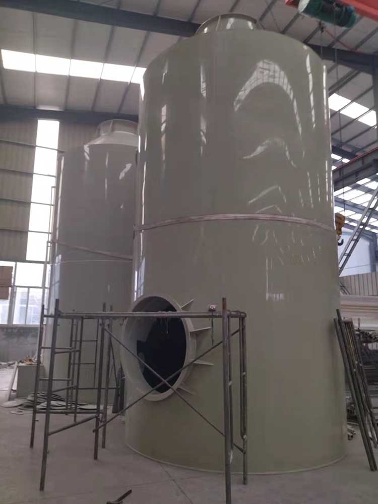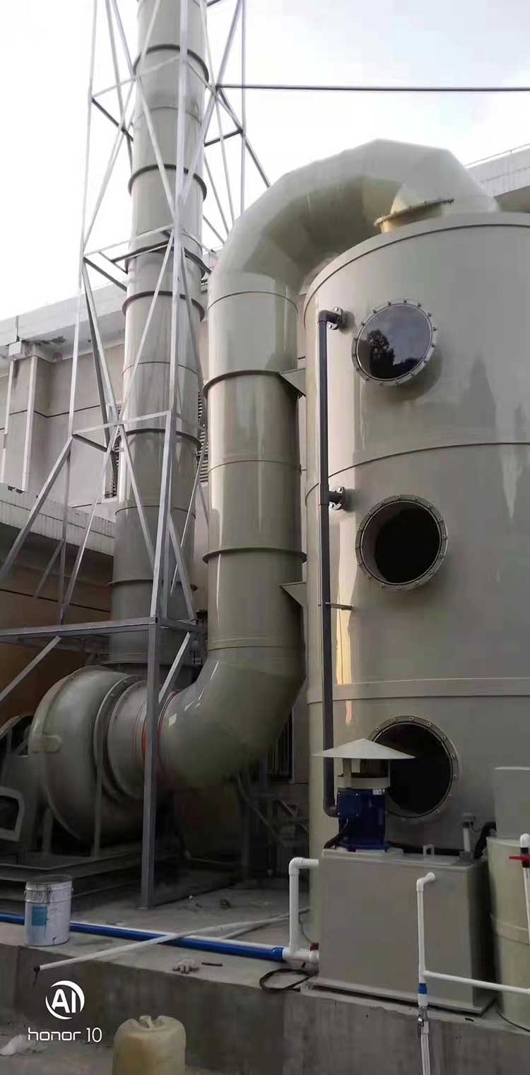 1.5萬風(fēng)量pp噴淋塔塔規(guī)格為:ф1.8m*H4.0m*10mm。進(jìn)、出風(fēng)口直徑均為600mm。循環(huán)水量每小時(shí)22立方。每小時(shí)處理廢氣量15000立方左右。凈化塔整體厚度為8mm PP板。塔體內(nèi)部有二層水噴淋裝置,三層浮球填充,帶水箱和2.2KW純銅芯普通循環(huán)水泵。