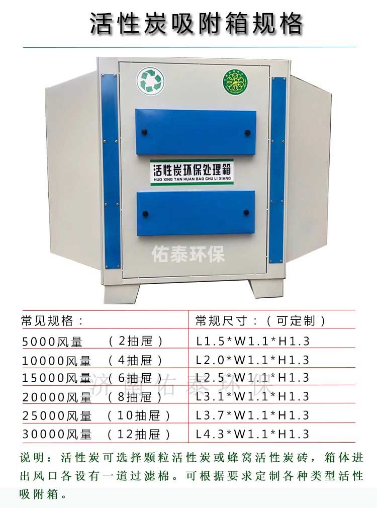 活性炭環(huán)保吸附箱根據(jù)風(fēng)量不同,匹配相應(yīng)的活性炭環(huán)保箱,常見的型號(hào)如下所示。可以根據(jù)客戶的要求定制。