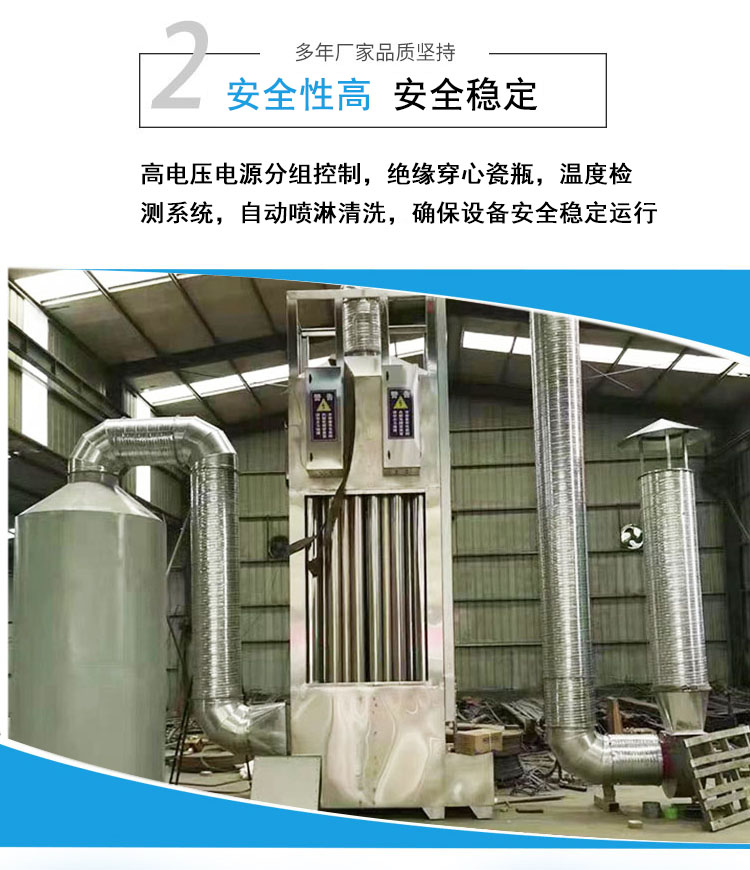 2.高壓靜電場(chǎng)電壓可以達(dá)到35KV以上,電暈電流50mA以上對(duì)于極微小的粉塵和油霧顆粒捕捉能力很強(qiáng)。排放氣體為較淡的蒸汽,無(wú)異味。
