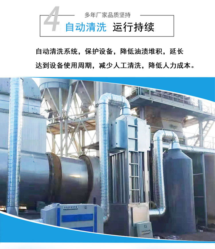 1.采用創(chuàng)新性的噴淋和多層高壓靜電場(chǎng)一體化混合設(shè)計(jì),除塵、除油煙、降溫、滅火效果優(yōu)異,沒(méi)有滴油、堵塞、燃燒的現(xiàn)象發(fā)生。