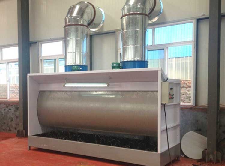 3.2、二是漆霧捕捉系統(tǒng):采用外水幕厚度0.6mm的201不銹鋼,兩個水槽,兩層內(nèi)擋板組成的2級水簾漆霧捕捉系統(tǒng),捕捉漆霧中的顆粒狀涂料成分。水幕形成的水膜能吸附空氣中顆粒狀固體雜質(zhì),2級水幕對進入內(nèi)風道的空氣進行除塵。內(nèi)風道內(nèi),由于氣流轉(zhuǎn)向形成渦流,