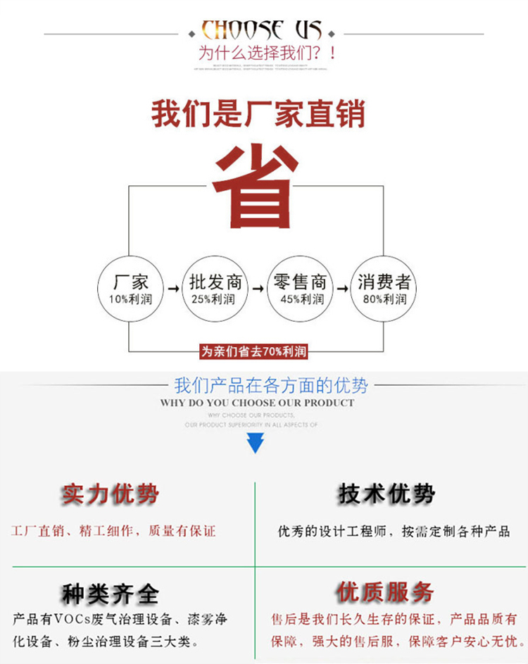 公司的環(huán)保設備有VOCs廢氣處理設備、工業(yè)粉塵處理設備兩大類。廢氣治理環(huán)保設備有催化燃燒設備、pp噴淋塔活性炭吸附箱、移動伸縮噴漆房、氣旋塔水簾噴漆柜、漆水分離一體機等環(huán)保設備。粉塵處理設備包括濾筒式脈沖除塵器、布袋除塵器打磨吸塵工作、水簾式打磨臺等設備。我們可以根據企業(yè)的實際情況定制合適的環(huán)保設備。歡迎您來電咨詢15665879292,或者添加網頁下面微信,把您的廢氣治理需求告訴我們,我們?yōu)槟峁┰O備的詳細參數、配置及價格,為你提供相關設備的案例圖片或視頻,同時可以給您發(fā)公司車間正在加工設備的視頻或圖片。