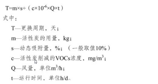 計算示例:某企業(yè),通過活性炭吸附設施處理的VOCs廢氣風量為10000m3/h,廢氣進口VOCs濃度為200mg/m3,出口VOCs濃度為40mg/m3(即活性炭削減VOCs濃度為160mg/m3),每日運行時間8小時,活性炭吸附設施填充活性炭1000kg,則更換周期為7天!